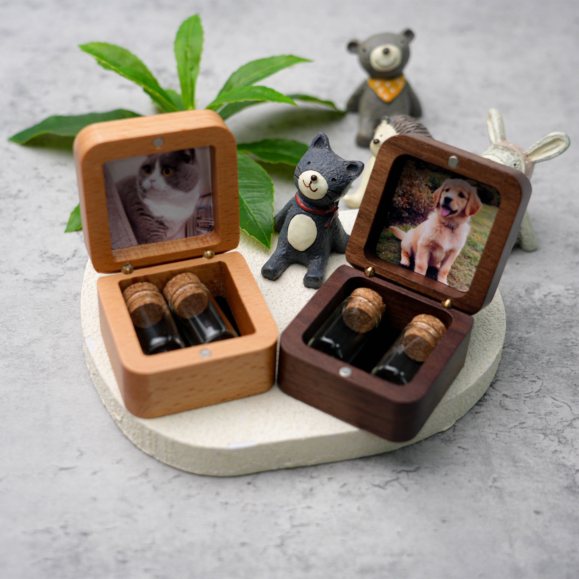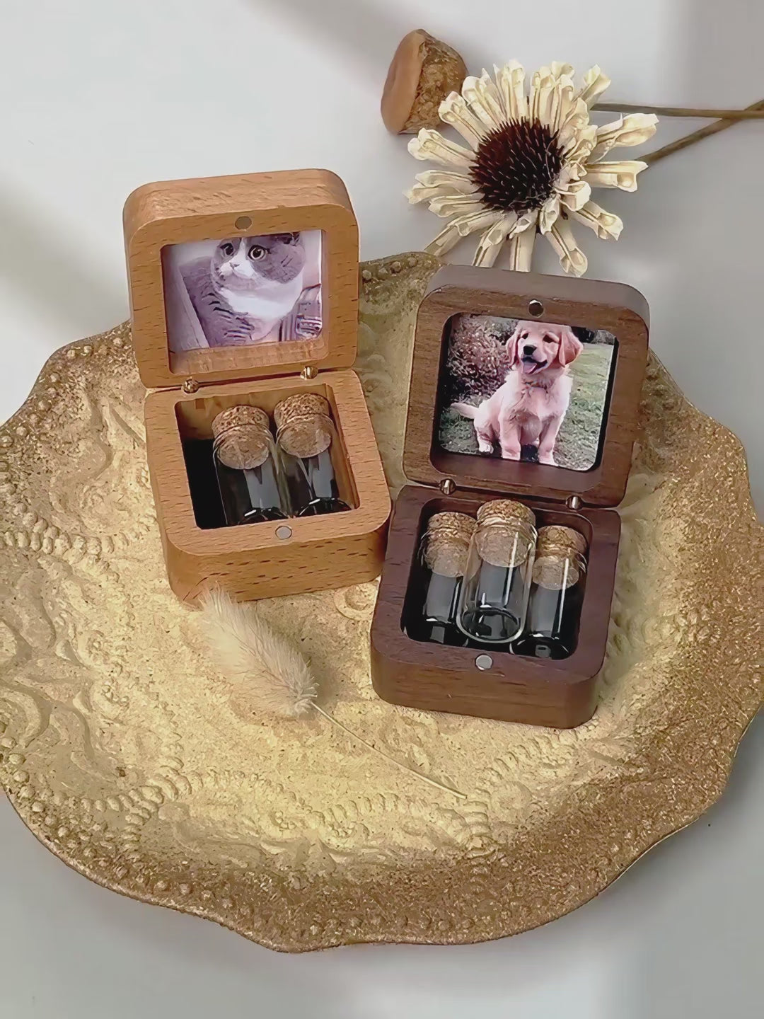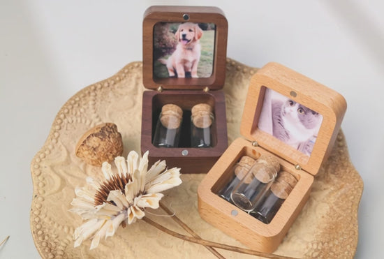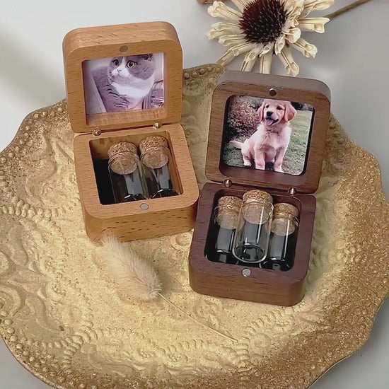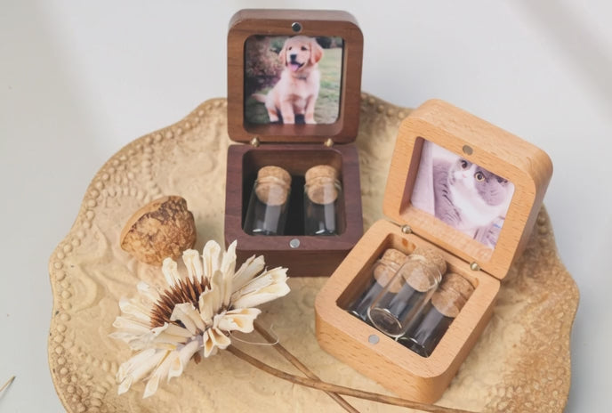 This palm-sized wooden memorial box safely holds a small lock of fur or symbolic ashes. We can engrave your pet's name/date on the lid and customize the inner cover with a photo📸